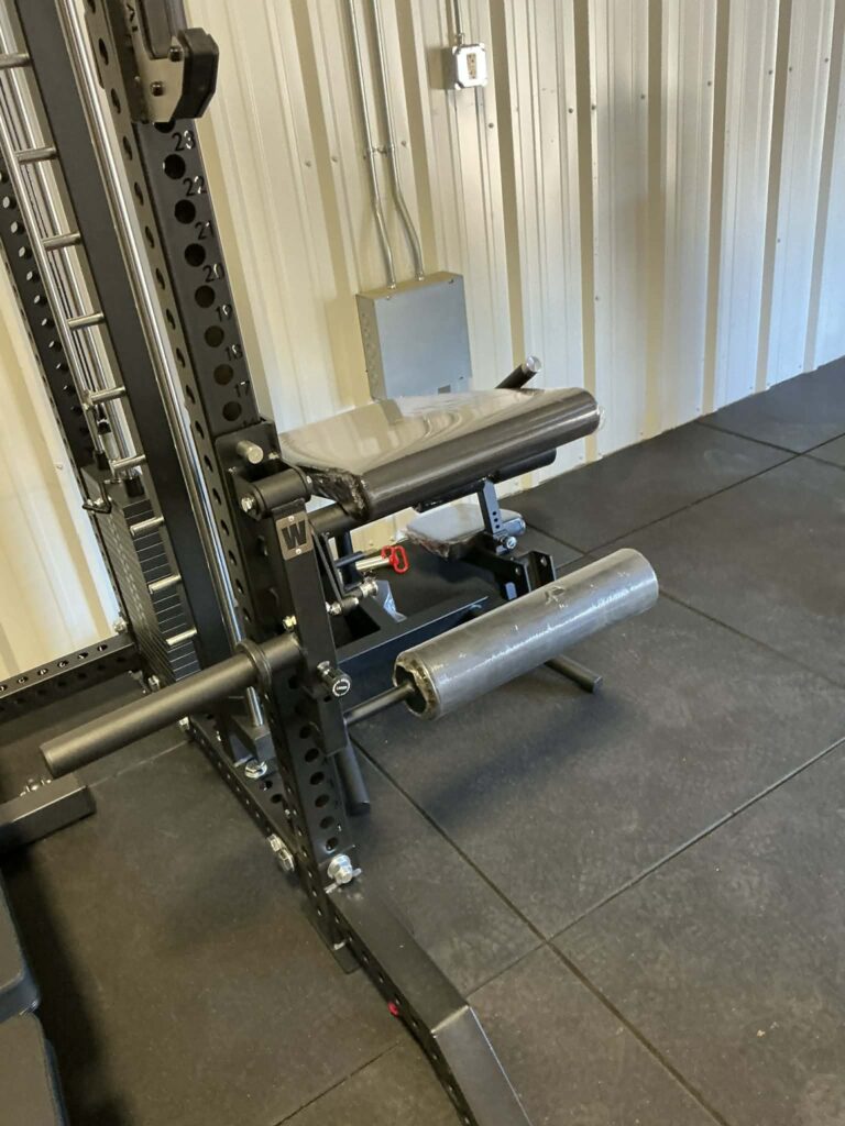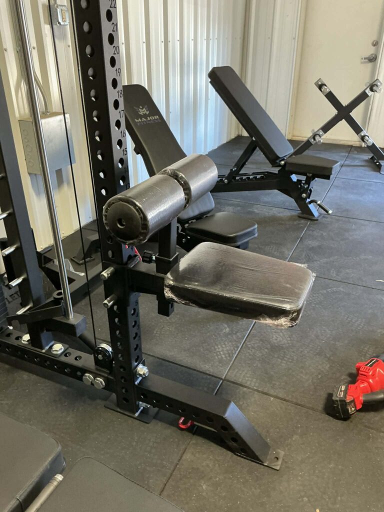 rack mounted leg extension attachment. fits onto 3×3 racks with 1 inch holes. allows you to perform leg extensions with a lot of weight. very space saving piece.